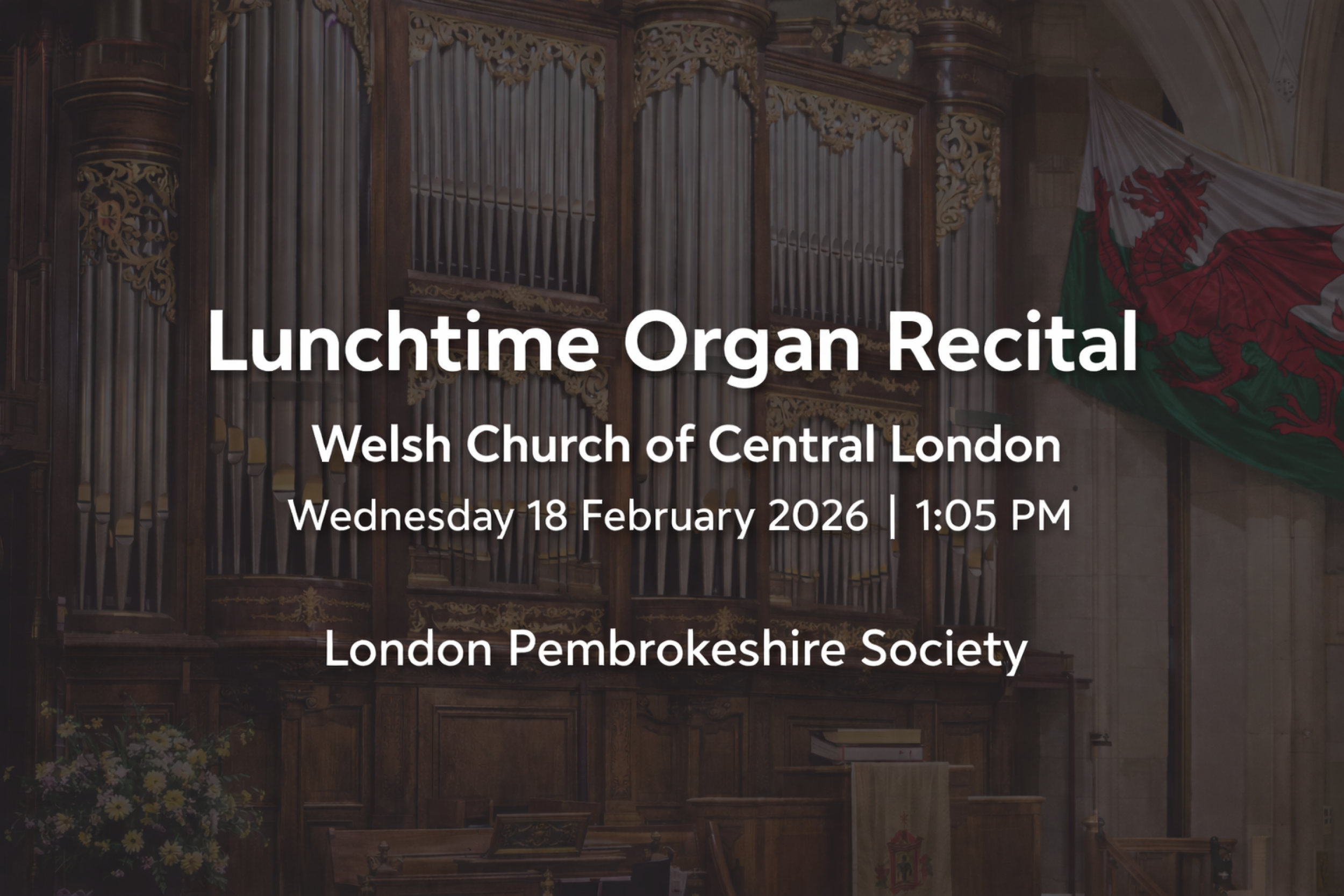 As part of Wales Week London 2026, the London Pembrokeshire Society invites you to a Lunchtime Organ Recital at the Welsh Church of Central London.